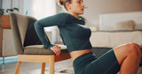 Chair, dips and fitness with woman in bedroom of home for power or strength training routine. Balance, exercise and triceps workout with serious person in apartment for health or wellness session