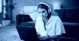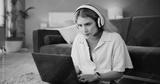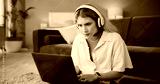 Laptop, remote work or woman with headphone in house, reading resume or screening online for hiring. Recruiting, streaming music or talent scout review cv for candidate selection, tech or post job ad