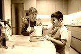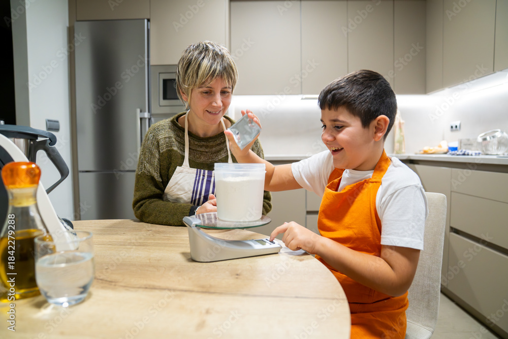 Mother and son enjoying baking together in a modern kitchen. Boy learning to weigh flour on a digital scale