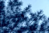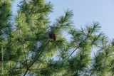 Green branches White pine Pinus with long needles and single brown cone, set against soft blue sky, creating natural and refreshing outdoor scene.