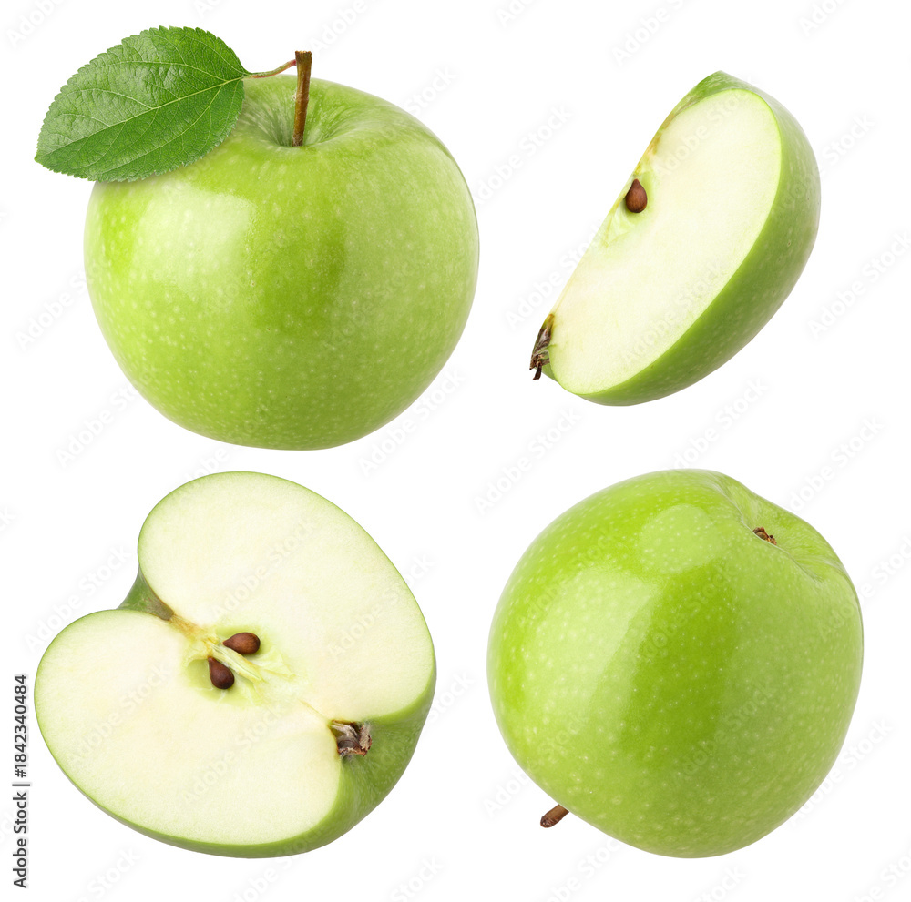 green apple with leaves (granny smith apple), half and slices isolated, transparent PNG, PNG format