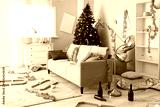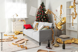 Interior of messy living room with sofa and tinsel after New Year party
