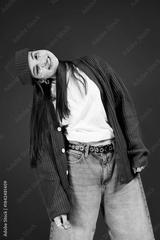 Trendy teenage girl showcases winter style in vibrant studio setting