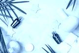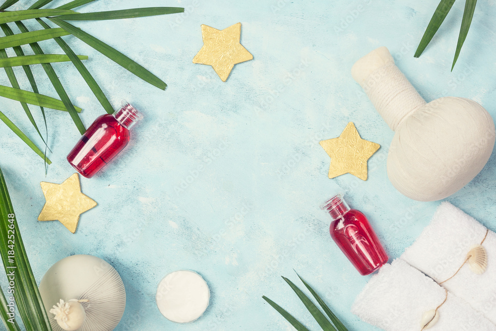 Flat lay top view spa background: thai massage bag, towels and palm leaves on blue background. Healthy lifestyle. Text space
