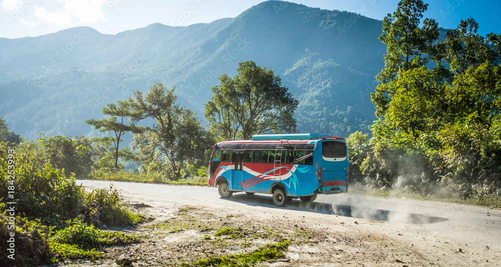 Colourful local bus on mountain road, Annapurna area, Nepal