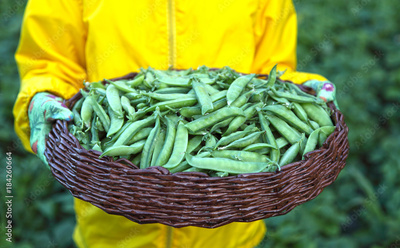 The crop of peas lies in a wicker brown basket. Green vegetables are grown using organic farming.