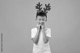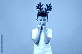 A joyful young boy stands against a blue background, wearing vibrant reindeer antlers. He closes his eyes and smiles, showcasing pure excitement for the holiday season.