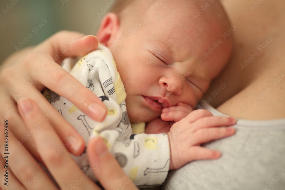 A baby is sleeping in a mothers arms. The baby is wearing a yellow shirt with a giraffe on it