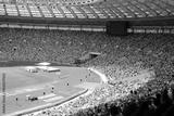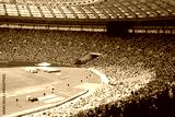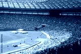 A stadium full of people watching a race. The crowd is packed in the stands, and there are umbrellas being held by some of the spectators