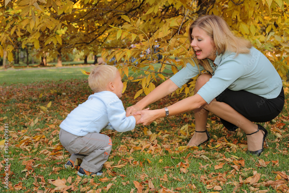 A woman and a child are playing in the park. The woman is holding the childs hand and they are both smiling. Scene is happy and playful
