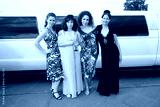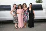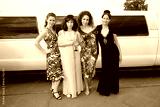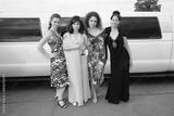 Four women in fancy dresses pose for a picture in front of a white limousine. Scene is elegant and sophisticated, as the women are dressed up for a special occasion