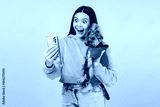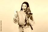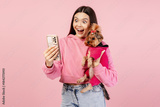 Young woman holding her pet dog and smartphone, surprised by the result of a selfie