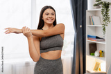 Young woman confidently stretching arm at home, smiling and staying active