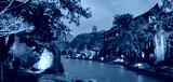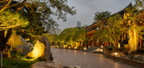 Diamond Hill, Kowloon, Hong Kong : illuminated rocks and traditional wooden gallery in Nan Lian Garden at night. Empty walkway with trees and urban skyline behind
