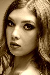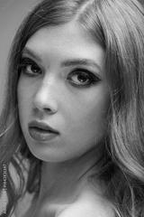 Bold eye makeup transforms a beautiful redhead in a grey studio