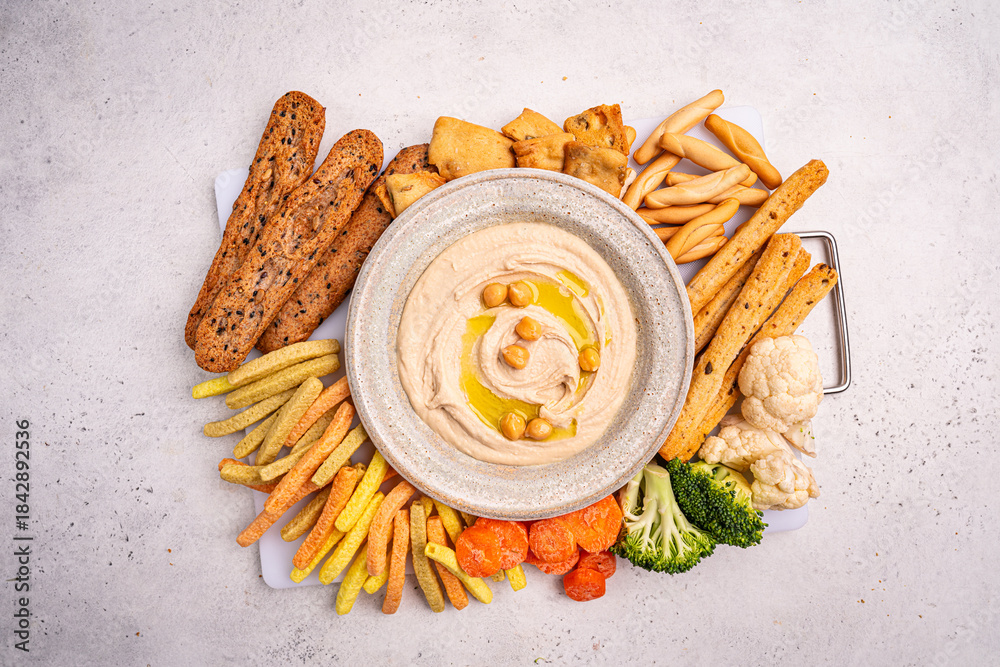 Various hummus dips in different colours. Hummus with dry crackers, top view. Vegan and traditional hummus as healthy and vegan snack.