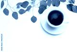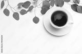 Floral composition made of green eucalyptus leaves and branches on white wooden background with cup of coffee. Feminine office desk, styled stock image, flat lay, top view with empty space.