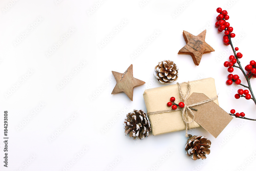 Christmas festive styled stock image. Floral frame composition with gift box, craft paper tag, pine cones, eucalyptus branches, wooden stars and holly berries on white wooden background. Flat lay, top