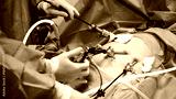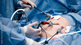 Surgical team performing minimally invasive procedure with advanced instruments on patient, showcasing precision and expertise in a sterile operating room environment