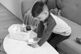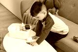 Little boy taking pills from table at home. Child in danger