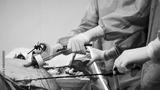 Surgical team performing a complex procedure using advanced tools and techniques, showcasing precision and teamwork in a sterile operating room environment