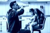 Man drinking alcohol while wife hugging their son on background