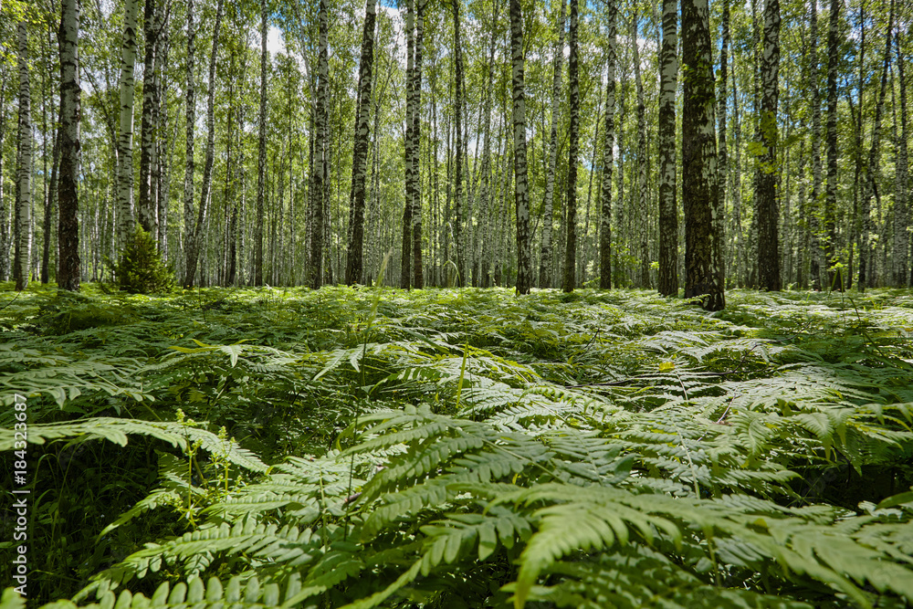 Beautiful scenery with white birches. Birches in bright sunlight. Birch grove in the summer. Birch trunks with white bark. Tops of birch against the sky. Sunny highlight.