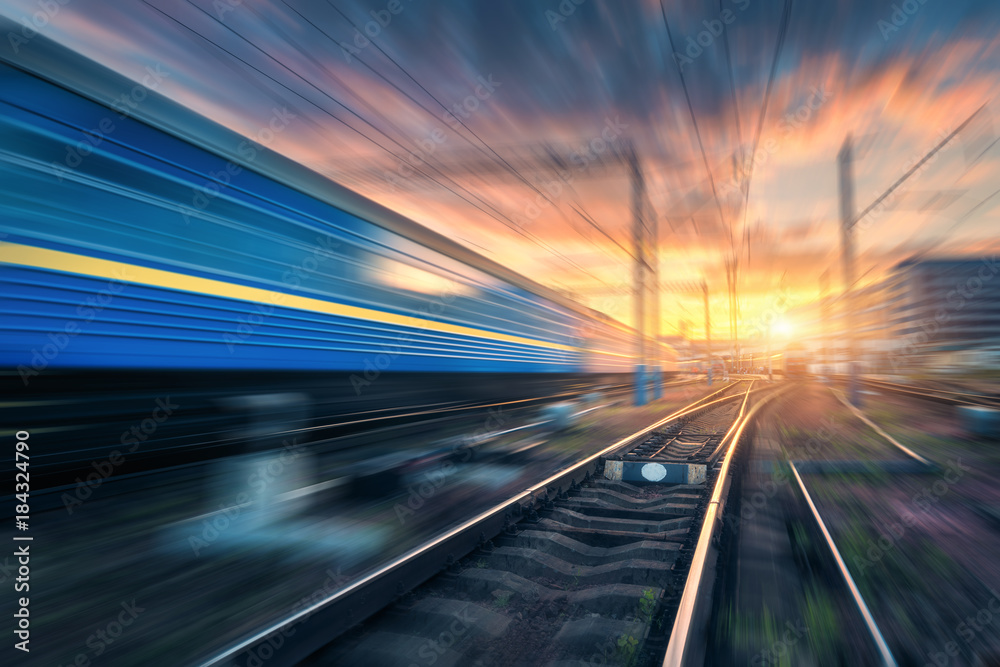 Railway station with motion blur effect. Blurred railroad. Industrial conceptual landscape with blurred railway station, speed train, blue sky with colorful clouds and sun. Railway track. Background