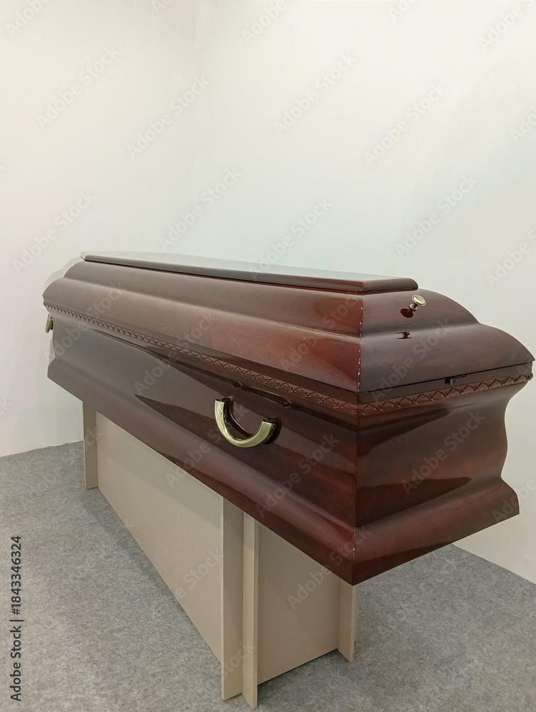 Polished brown wood coffin with closed lid and brass handles, displayed on stand. Elite Grob manufactures coffins in Kurganinsk.