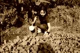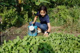 Woman watering vegetables in an outdoor planting brush.
