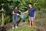 Woman and man watering vegetables in an outdoor.