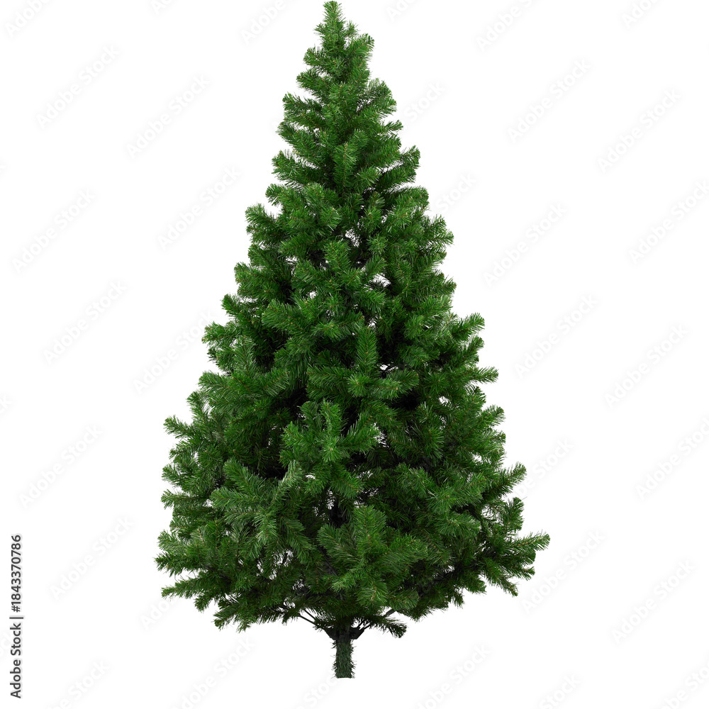 A tall full green christmas tree with a dark trunk isolated on a black background