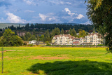 Green meadow framing waterfront residential buildings in salmon arm, british columbia