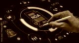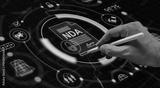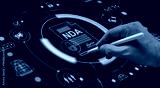Hand with stylus signing digital NDA document on futuristic HUD interface screen displaying secure icons and technology symbols in business context.