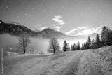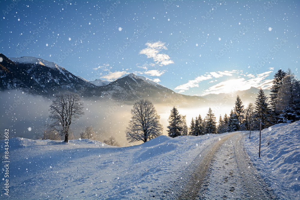 View to a icy road with snowfall and mountain range of Gasteinertal valley near Bad Gastein, Pongau austrian Alps - Salzburg Austria Europe