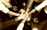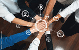 This image showcases a diverse group of hands joined together, symbolizing collaboration and ethical decision-making, surrounded by digital icons representing justice and innovation. Amity
