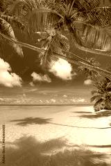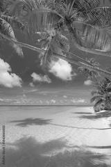 Tropical summer island beach landscape. Beautiful peaceful nature scene with turquoise ocean sunny sky and white sandy shore. Tranquil vacation wallpaper background. Idyllic travel holiday destination