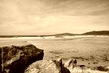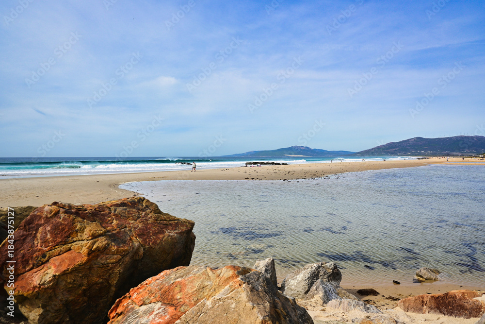 Waves crash on a sandy beach at Tarifa with rocks in the foreground