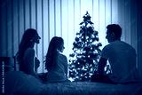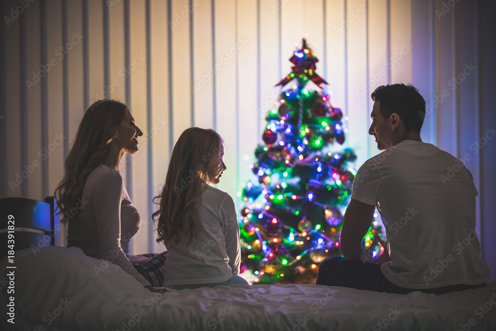 The happy family sit on the bed near the christmas tree