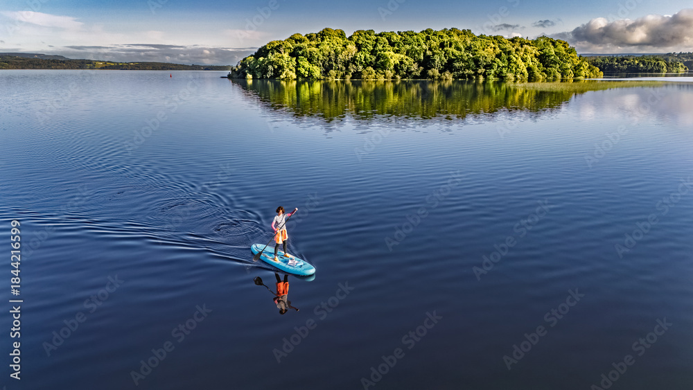 Active woman paddling SUP board on beautiful Lough Key lake, green islands and forest summer landscape on background, stand up paddling water adventure outdoors, Ireland