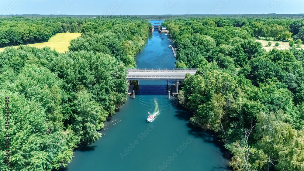 Bridge over canal with boat aerial drone view, dutch landscape, transportation concept, the Netherlands