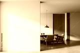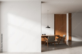 Modern interior with wooden dining area, pendant light and large blank white wall perfect for poster mockup or advertising presentation concept. 3D Rendering