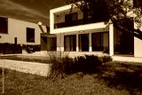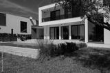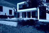 Modern luxury villa with swimming pool and clean minimalist architecture under a blue sky. Contemporary residential exterior featuring large windows, terrace, and elegant outdoor living space
