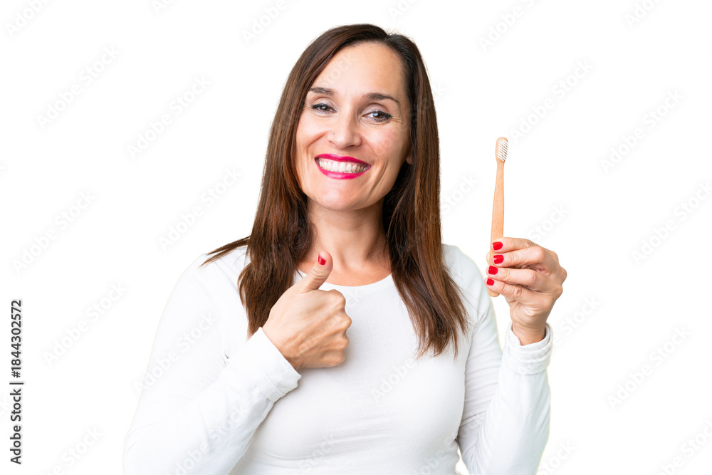 Middle age woman brushing teeth over isolated chroma key background with thumbs up because something good has happened