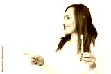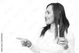 Middle age woman brushing teeth over isolated chroma key background pointing to the side to present a product