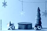 Empty wooden stand for products with carved Christmas tree and golden star.