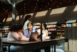 A group of three female students are sitting at a table in front of laptops and talking while a female student is standing next to them holding a notebook and they are laughing