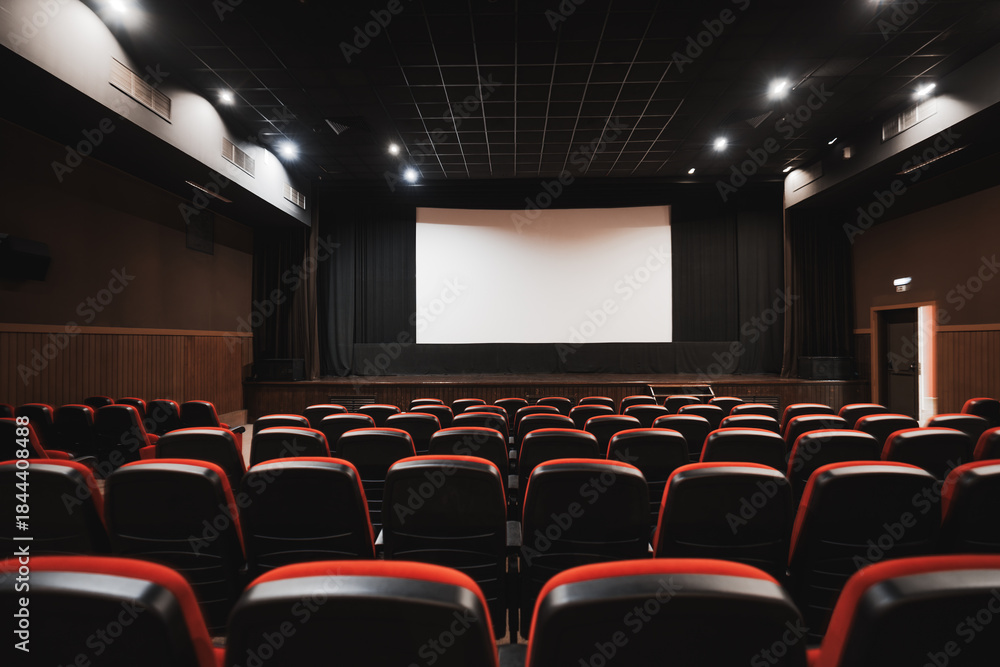 Empty cinema auditorium with rows of red and black seats facing blank projection screen, modern movie theater interior before screening, entertainment and event venue concept; low key shot