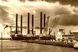 Large Red Cargo Ship At Port With Cranes And Ferry Docked Beside Waterfront, Esbjerg, Denmark
