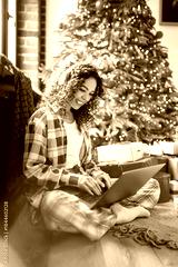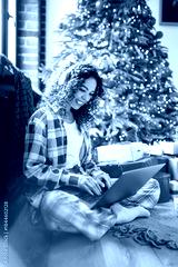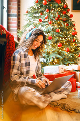 Cheerful woman with laptop and New Year's gifts is shopping online. A beautiful woman is having fun in decorated room with Christmas tree in background. Online shopping concept.